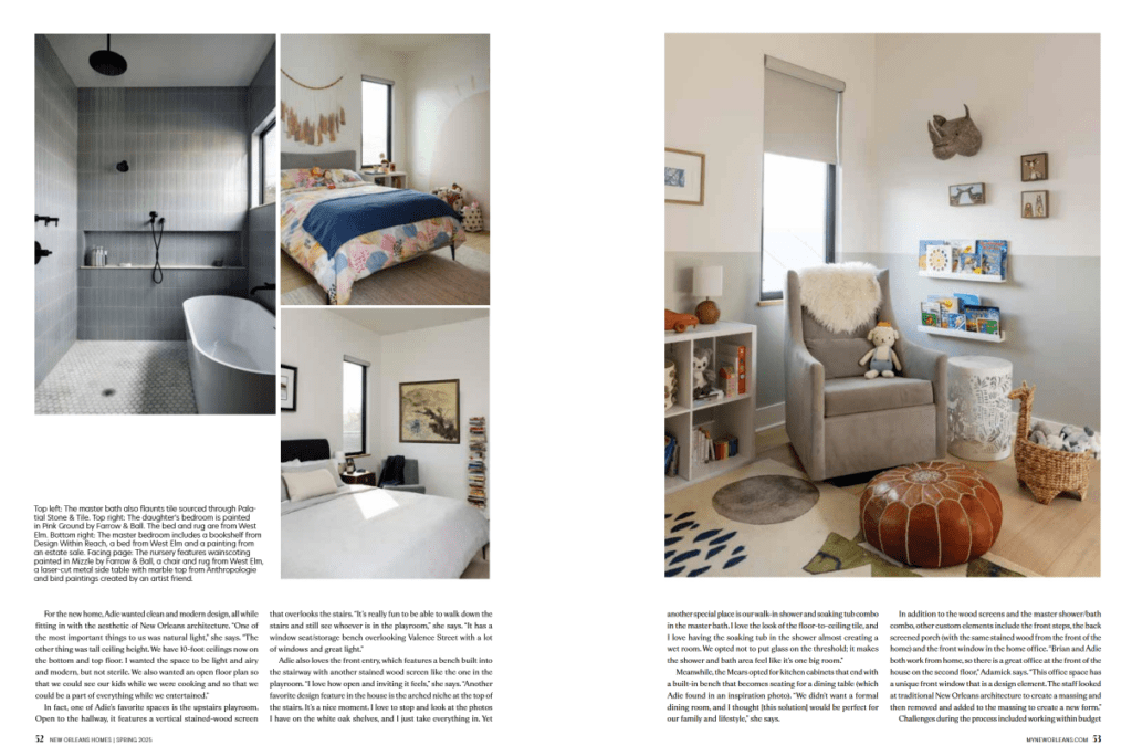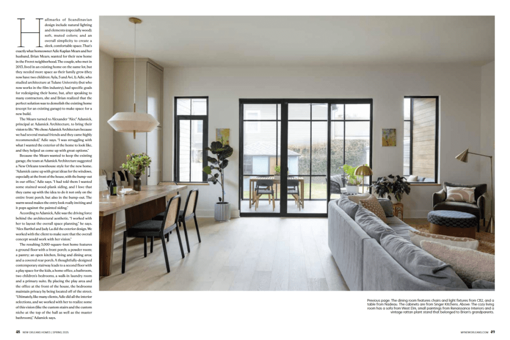 Our Contemporary Townhouse design was recently featured in New Orleans Homes Magazine Spring Issue. This modern Scandinavian-inspired single-family residence in the historic Freret neighborhood was built on the site of a previous teardown. Our design team approached this project as a unique opportunity to blend modern minimalism with the historic form of a traditional New Orleans townhouse. The result is a magazine worthy home that balances contemporary style with the rich architectural heritage of New Orleans.