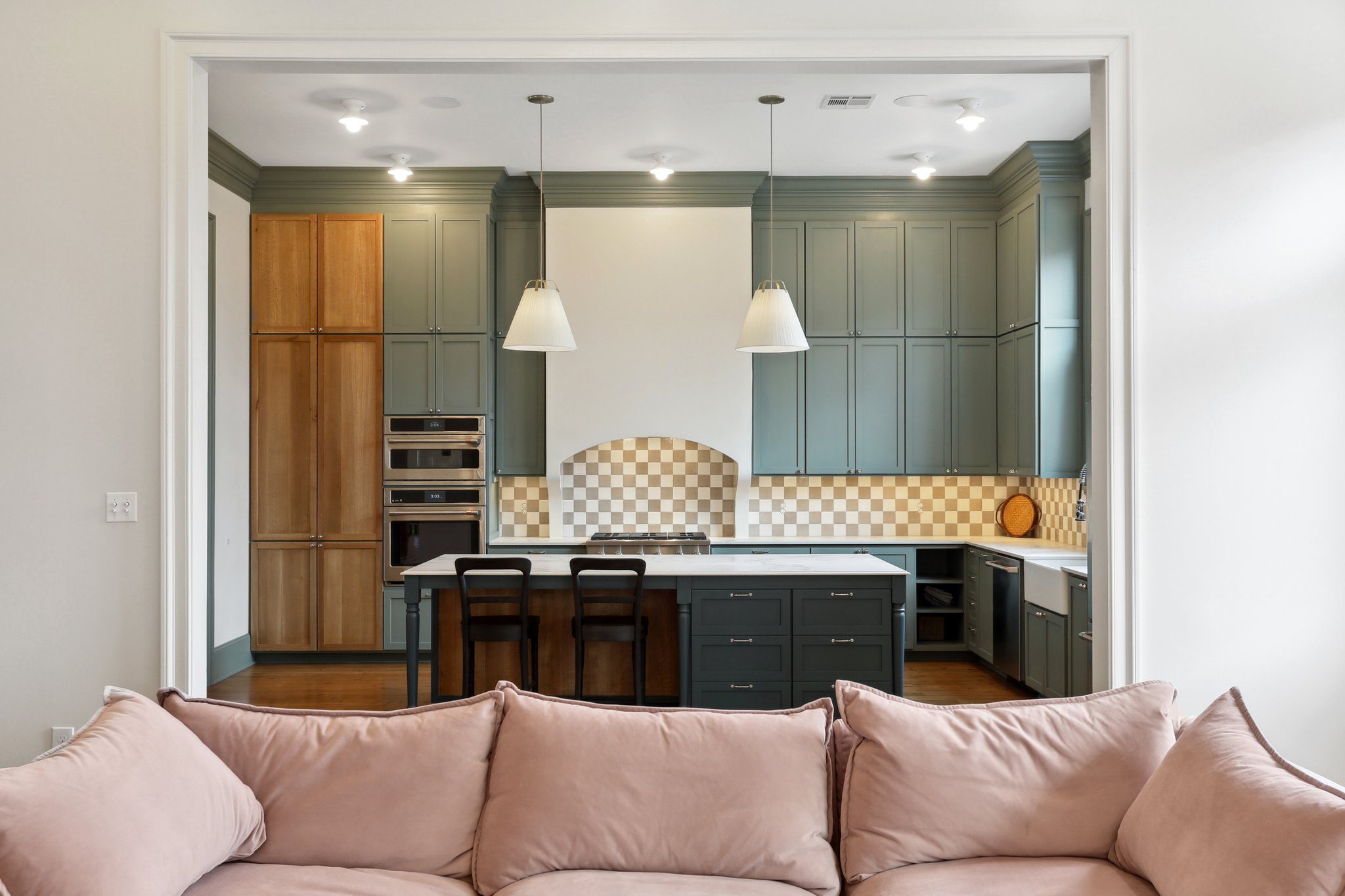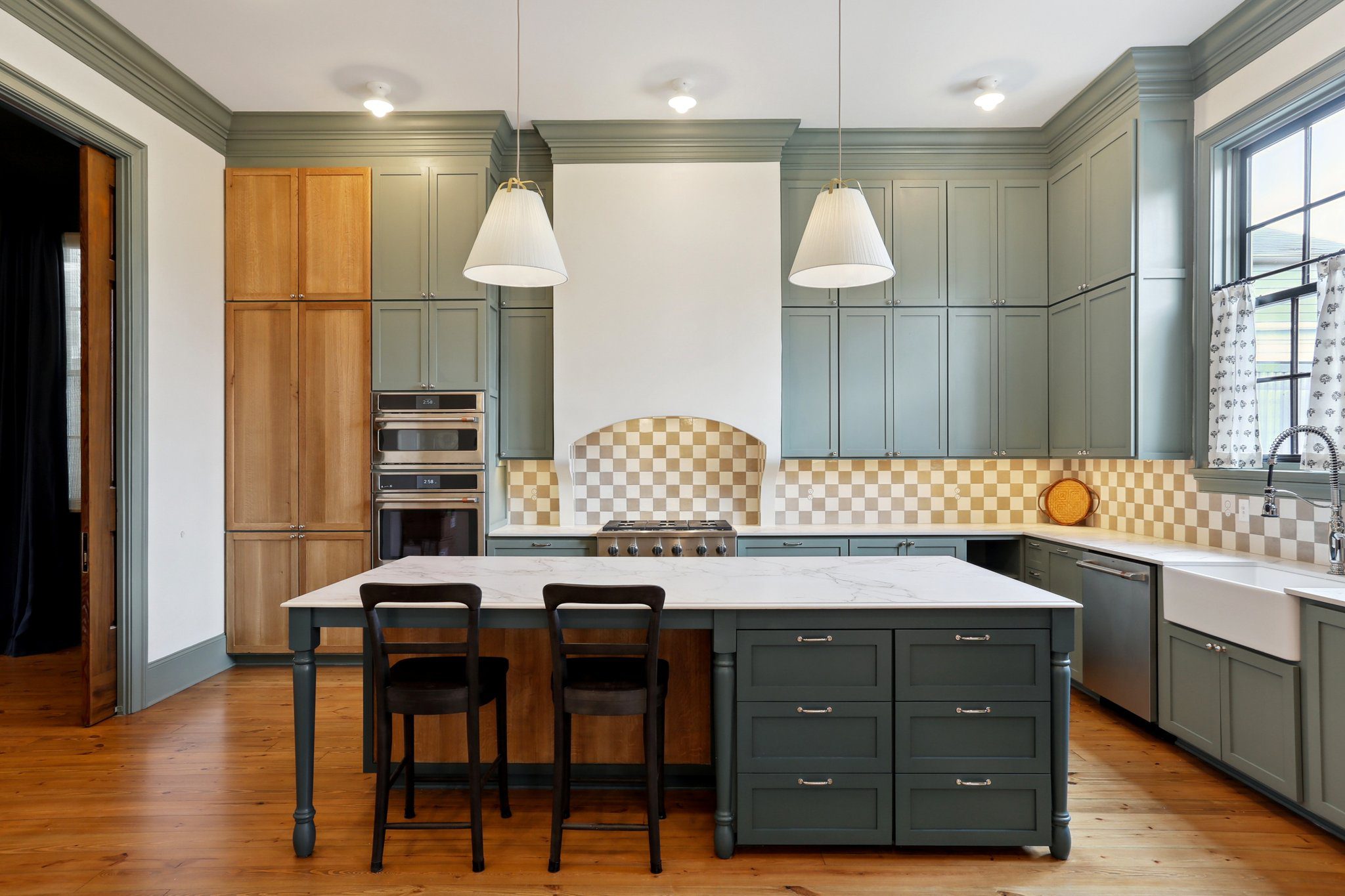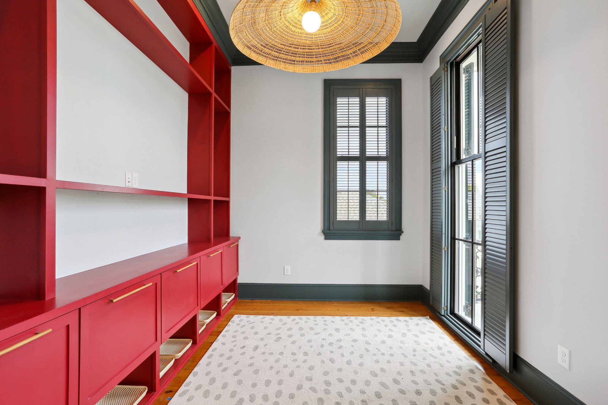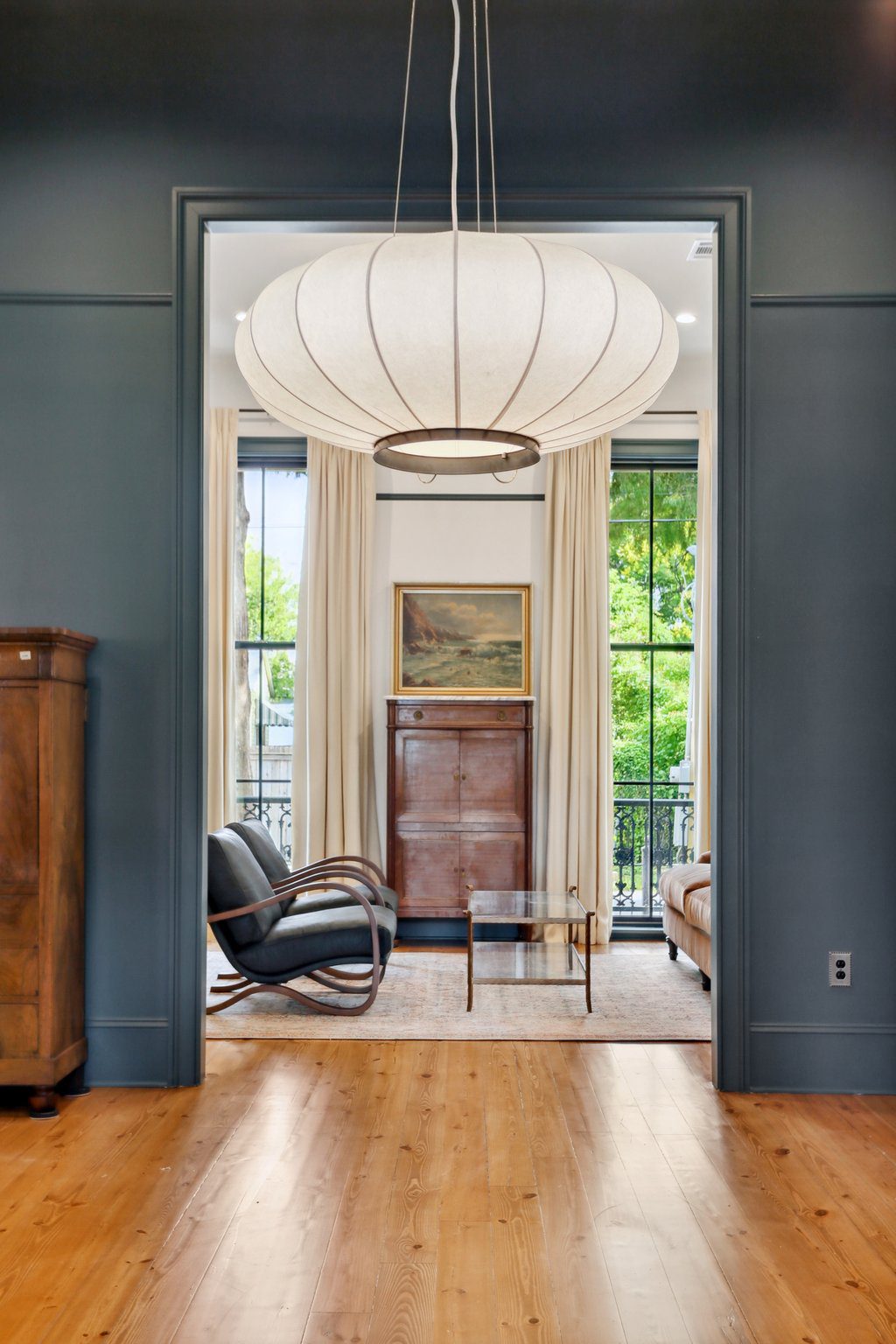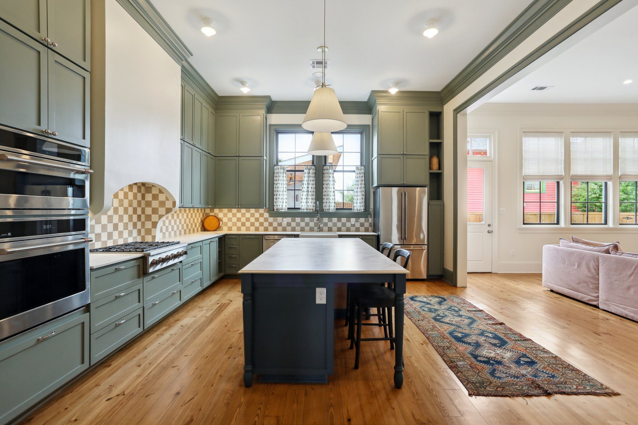 Adamick Architecture designed this new construction home for a growing family on a vacant lot in the Irish Channel. While it’s a ground-up build, the design draws heavily from traditional New Orleans vernacular so it feels right at home in the historic neighborhood. The house features a split three-bay/two-bay massing with a double gallery at the front — a detail common to the area — paired with large floor-to-ceiling windows that bring in natural light. The site plan accommodates modern needs with a carport, swimming pool, and pool house at the rear.