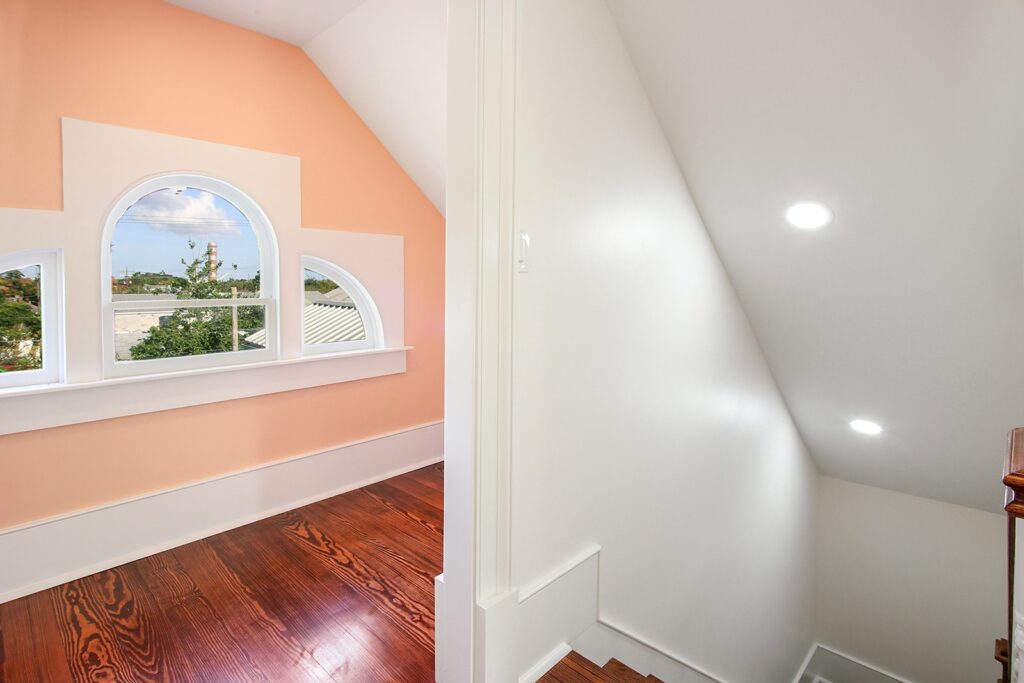 This home in in the Irish Channel, an eye-catching and tasteful new construction, is the new home of our principal architect. Alec Adamick wanted to build a new home for his growing family that had adequate space using a palette of rich colors and finishes. Last October, he found an empty lot in the historic Irish Channel and built a 2400 square foot, three-story house with an additional 375 square feet of covered and screened-in porches. The Adamick residence was designed by Alec himself and built by Pentek Homes. This new residential construction takes the form of a traditional camelback, and its details are inspired by the Eastlake and Queen Anne styles with a spacious floor plan and double parlor. The Eastlake style is apparent at the beautiful front porch of the home with turned colonettes and an openwork frieze overhang, while the Queen Anne style shows through the use of fish-scale shingles and tripartite window at the top floor of the home. When you initially enter the double parlor, you are greeted by beautiful, locally-made chandeliers and medallions that complement the royal purple walls in both the great room and dining area. After you pass through these spaces, you enter an open kitchen and living space. The kitchen appliances, as well as the custom cabinetry and millwork, are primarily black and stainless steel with granite countertops. The screened-in porch at the back of the house allows the family to enjoy the lush garden while keeping the bugs away. The living quarters of the second floor have many large windows that allow natural light to grace the hardwood flooring in the rooms. The master bedroom and bathroom overlook the large backyard. The focal points of both master and kid’s bathrooms are reclaimed antique consoles that now serve as bathroom sink cabinetry. The master bath also features a chrome clawfoot tub and a walk-in shower. The third floor has a small office where one can look through the tripartite window back at the city’s skyline and a carpeted “rumpus” room that will host their guests and serve as a playroom for their son Gabriel. This single-family residence was fully approved by the Historic District Landmarks Commission for construction in a historic district.